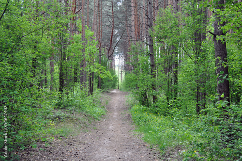 © AliaksaB, Obraz premium A path in a beautiful pine forest in central Europe.