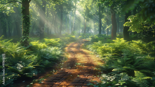 © jr-art, Obraz premium A path in a forest with sunlight shining through the trees