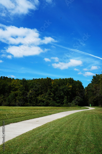 © michelledunlap, Fototapeta premium A path in a grassy area with trees and blue cloudy Sky