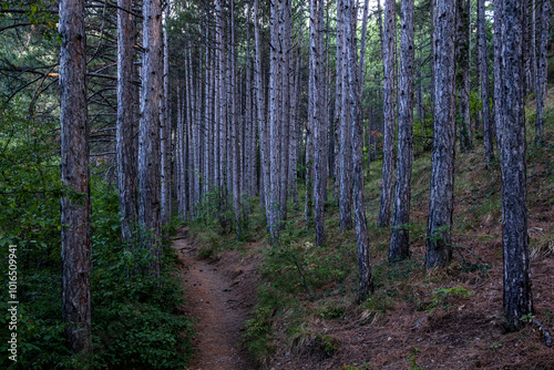 Obraz premium A path in a pine forest on a summer day.