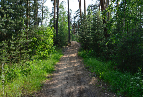 © Irina, Obraz premium A path in the dense forest with pine trees and sunlight