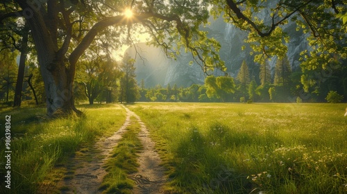 © auttawit, Fototapeta premium A path leads through a lush green field with a tree in the background