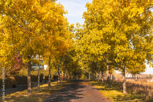 Naklejka premium A path lined with trees is covered in yellow leaves. The trees are tall and...