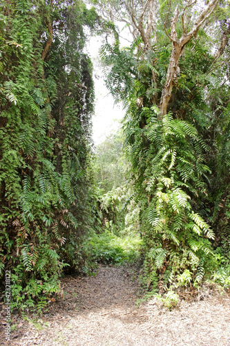 Fototapeta premium A path passes through a gap or opening in a lush green tropical forest