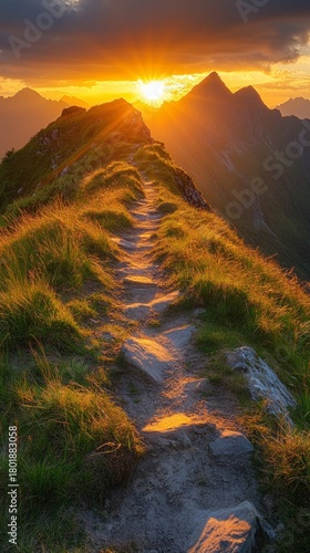 © COK House, Obraz premium A path stretching towards the horizon, illuminated by the sunrise over the mountain peaks, will serve as an inspiring backdrop for motivational posters or sports brands.