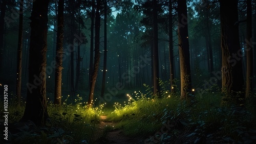 © mochalfin, Fototapeta premium A path through a dark forest lit by fireflies at night.