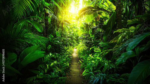 Fototapeta premium A path through a dense forest leading towards the light, symbolizing the...