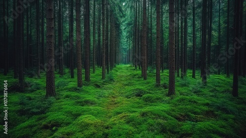 Obraz premium A path through a dense forest, lined with tall trees and covered in moss.