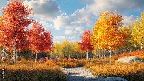 © kachanovski, Fototapeta premium a path through a field with trees and rocks