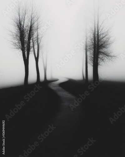 © Aleksandra, Obraz premium A path through a foggy forest with light breaking through the trees symbolizing navigating through uncertainty and toward potential.