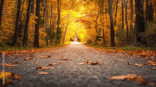 © vectcore, Obraz premium A path through a forest during autumn with vibrant orange and yellow leaves covering the ground and trees
