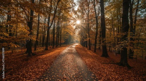 Naklejka premium A path through a forest in autumn with golden leaves and sunlight shining through the trees at the end