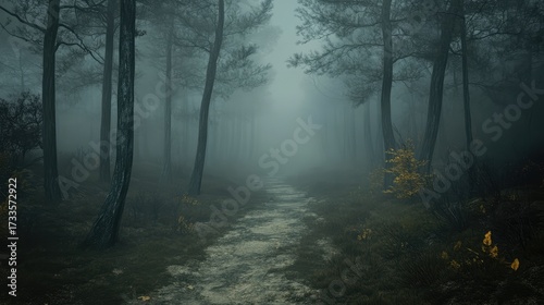 © krismicrostoker, Naklejka premium A path through a forest with foggy trees