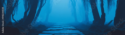 © eaglesky, Obraz premium A path through a forest with trees and a foggy sky. Scene is mysterious and eerie