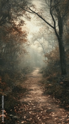 © soysuwan123, Fototapeta premium A path through a forest with trees and leaves on the ground