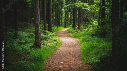 © krismicrostoker, Obraz premium A path through a forest with trees on both sides