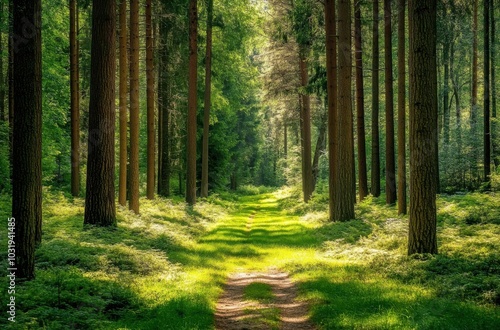 © Bambalino Studio, Obraz premium A path through a forest with trees on either side. The path is lined with grass and the sunlight is shining through the trees