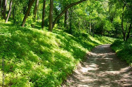 © Alexey Wraith, Obraz premium A path through a green forest lit by sunlight