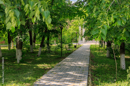 © Iurii Gagarin, Obraz premium A path through a park with trees and a bench