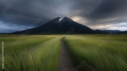 Fototapeta premium A path through a vibrant green field leading to a dramatic mountain peak under a stormy sky
