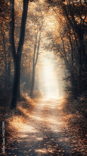 Fototapeta premium A path through an autumn forest with sunlight breaking through the trees.