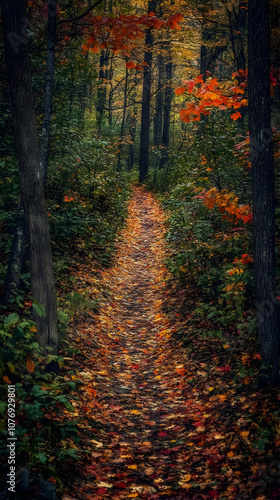 © CHURIN, Obraz premium A path through an autumnal forest, covered in fallen leaves, with a soft focus and a warm glow.