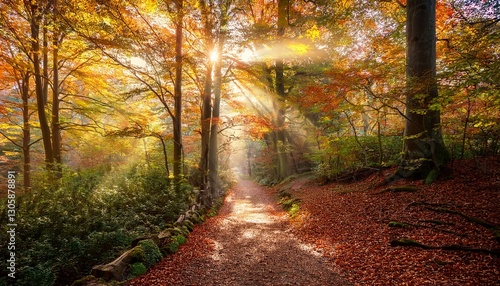 Obraz premium A Path Through Autumnal Forest, Sun Rays Piercing the Canopy