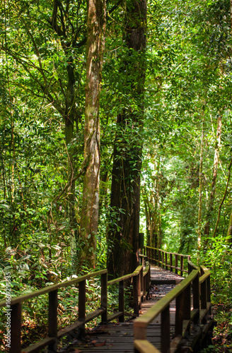 Fototapeta premium A path through the middle of a tropical rainforest with tall, dense trees provides a shady and comfortable atmosphere. This is the Nyadeng Forest in Berau, East Kalimantan, Indonesia.