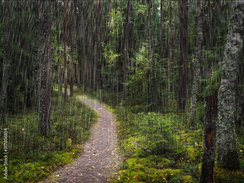 Obraz premium A path under trees in a deep forest.