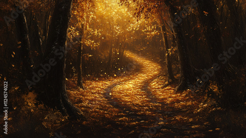 © GoldPumaze, Obraz premium A path winding through a golden woodland covered in fallen leaves.