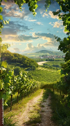 Fototapeta premium A path winds its way through a vibrant green vineyard, bordered by lush...