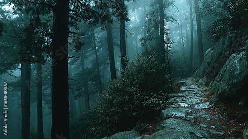 Obraz premium A path winds through a dark forest with tall trees and misty atmosphere.