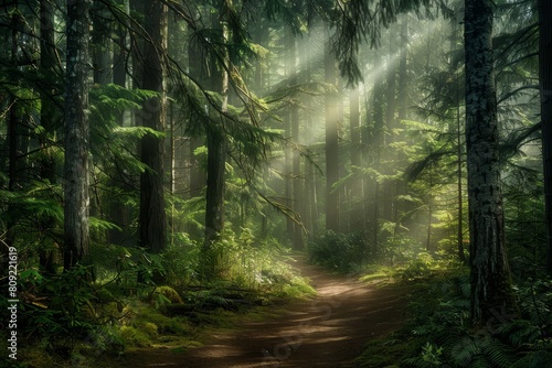 Obraz premium A path winds through a dense forest with sunlight filtering through the...