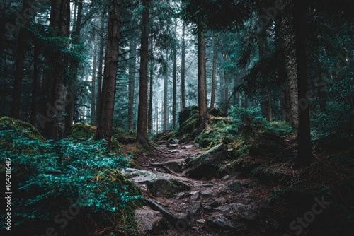 Obraz premium A path winds through a dense, misty forest.
