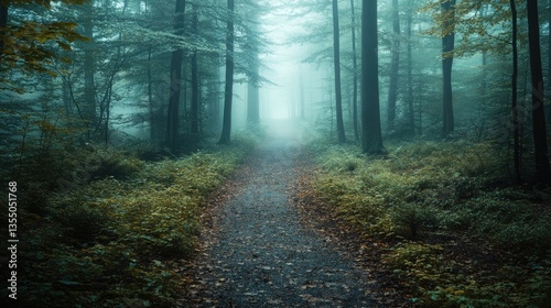 Fototapeta premium A pathway in a quiet forest leading into the mist, symbolizing the journey of...