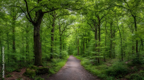Fototapeta premium A pathway through a dense forest of vibrant green trees.
