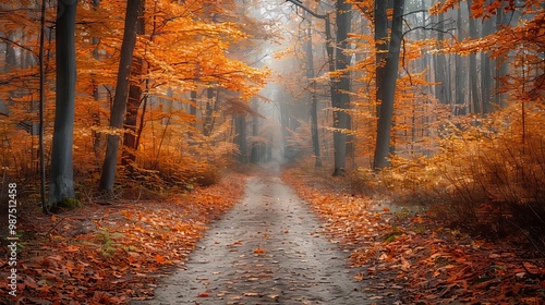 Obraz premium A Pathway Through an Autumnal Forest with Misty Ambiance