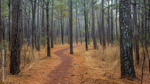 Naklejka premium A pathway winding through a dense pine grove, covered in a soft carpet of...