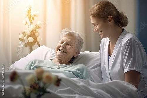 © Karlaage, Obraz premium A patient and a woman in a hospital bed created with Generative AI technology