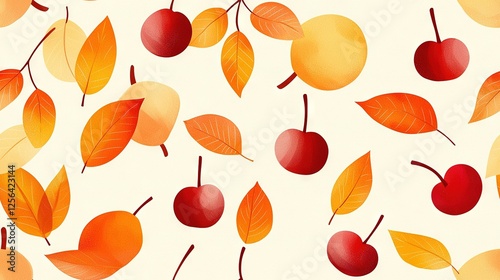 © Anna, Fototapeta premium A pattern of cherries, leaves, apples on a white background, with oranges and reds on them