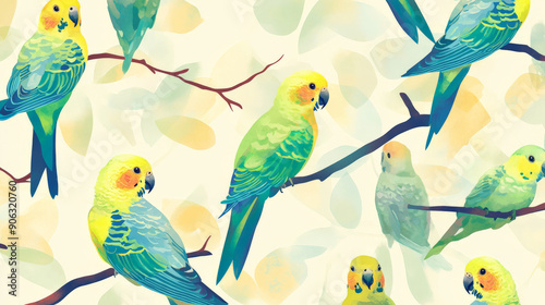 © wolfhound911, Obraz premium A pattern of colorful parakeets with feathers in shades of green, blue, and yellow, perched on branches, creating a cheerful and lively background.