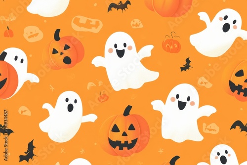 © SKIMP Art, Naklejka premium A pattern of cute cartoon ghosts and pumpkins on an orange background, creating a fun Halloween-themed design Generative AI
