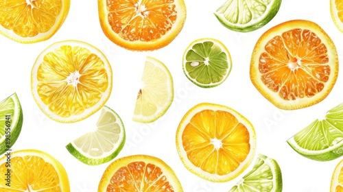 © Darya, Obraz premium A pattern of fresh citrus fruit slices, including oranges, lemons, and limes, arranged in a white background
