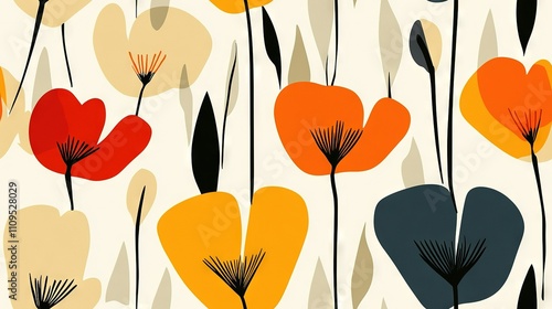 © Alice, Fototapeta premium A pattern of red, orange, and yellow flowers on a white background with long black stems