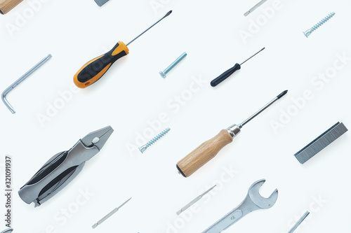 © Olga, Naklejka premium .A pattern of tools: nippers, screwdrivers, keys, bolts, staples for a stapler, self-tapping screws, nut on a white background..