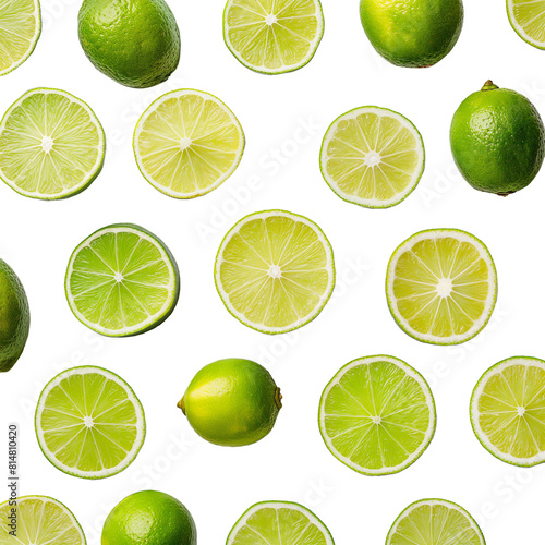 © กฤษณ์ นาคะชาต, Fototapeta premium A pattern of whole and halved fresh green limes arranged against a black background.