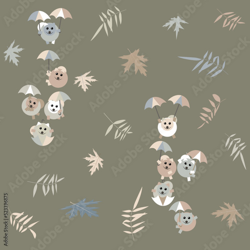 © IRYNA, Fototapeta premium a pattern without a background of pomeranian puppies flying on colorful umbrellas