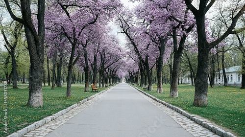 © meisa, Fototapeta premium A paved path lined with blossoming trees in a park.