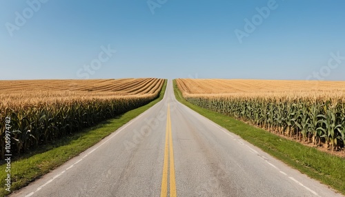Fototapeta premium A paved road running between lush green and golden cornfields in the countryside under a bright blue sky during daytime. Generative AI