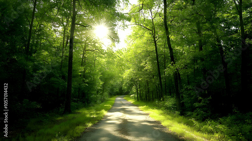 Fototapeta premium A paved road winds through a lush green forest with sunlight streaming...